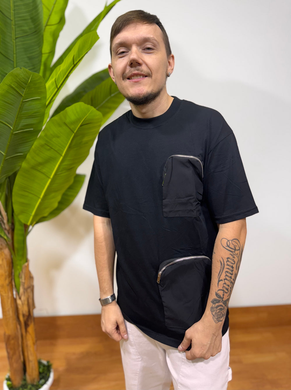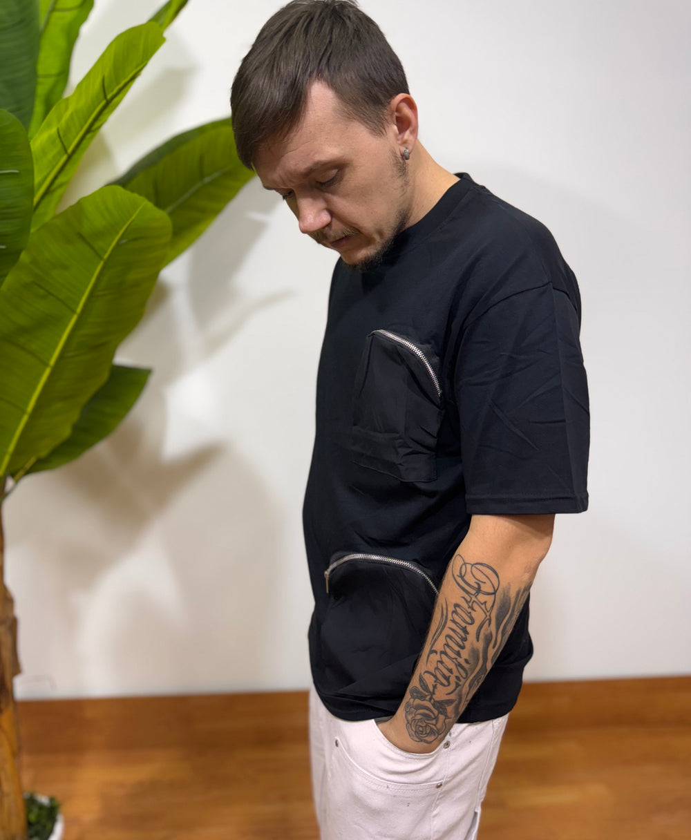 Rendi il tuo look più cool e funzionale con la T-shirt MILANO! In morbido cotone nero, con doppia tasca con zip che la rende perfetta per tenere al sicuro i tuoi oggetti. Pratica e alla moda, porta con te tutto ciò che ti serve ovunque tu vada.Il modello in foto è alto 1.72cm e pesa 55kg
